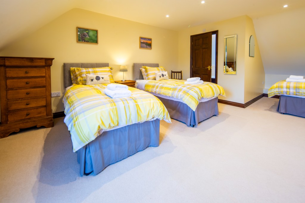 Upstairs, the two beautifully appointed en-suite bedrooms provide restful spaces to recharge for up to five guests. The main bedroom features a double bed, while the second bedroom has three single beds. A downstairs family shower room adds convenience for larger families.